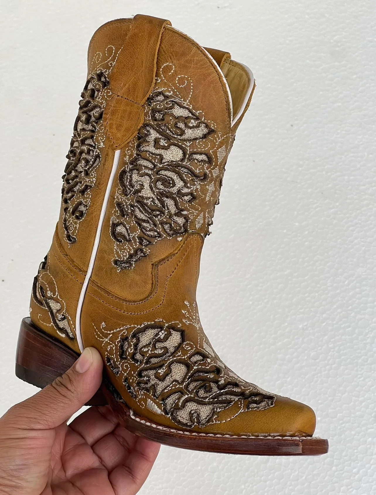 Kid’s Rustic Honey Leather Boots With Glitter Inlay—