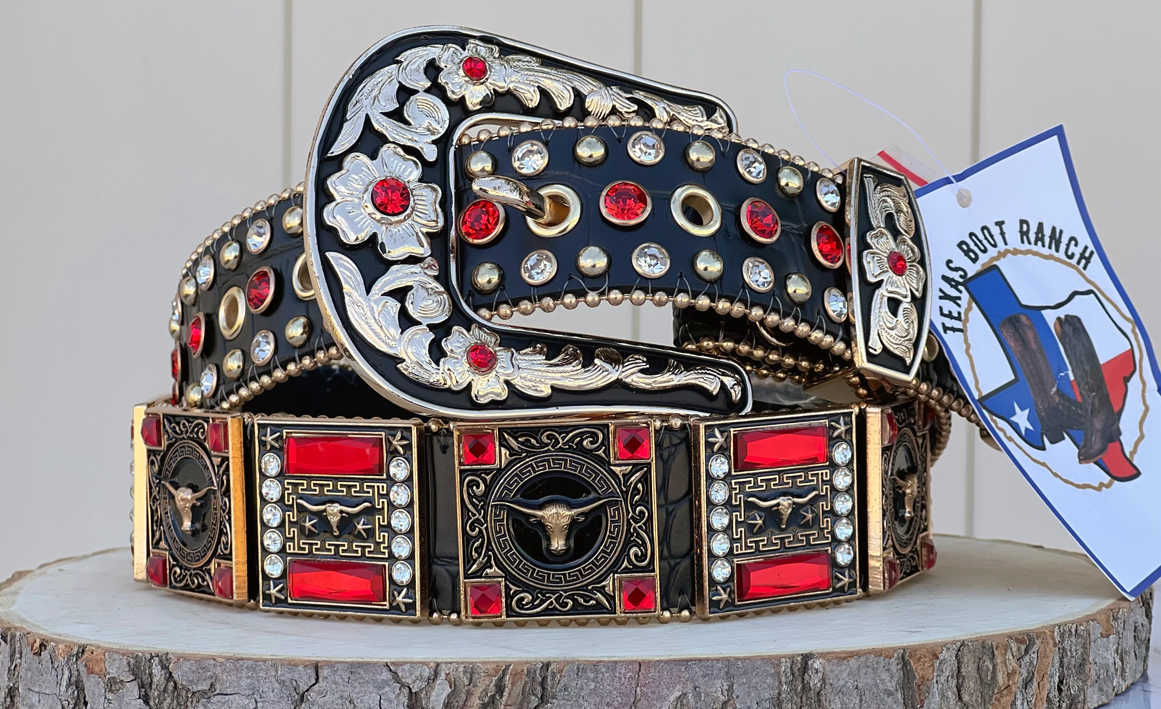 Western Black Longhorn Leather Belt With Red Rhinestones